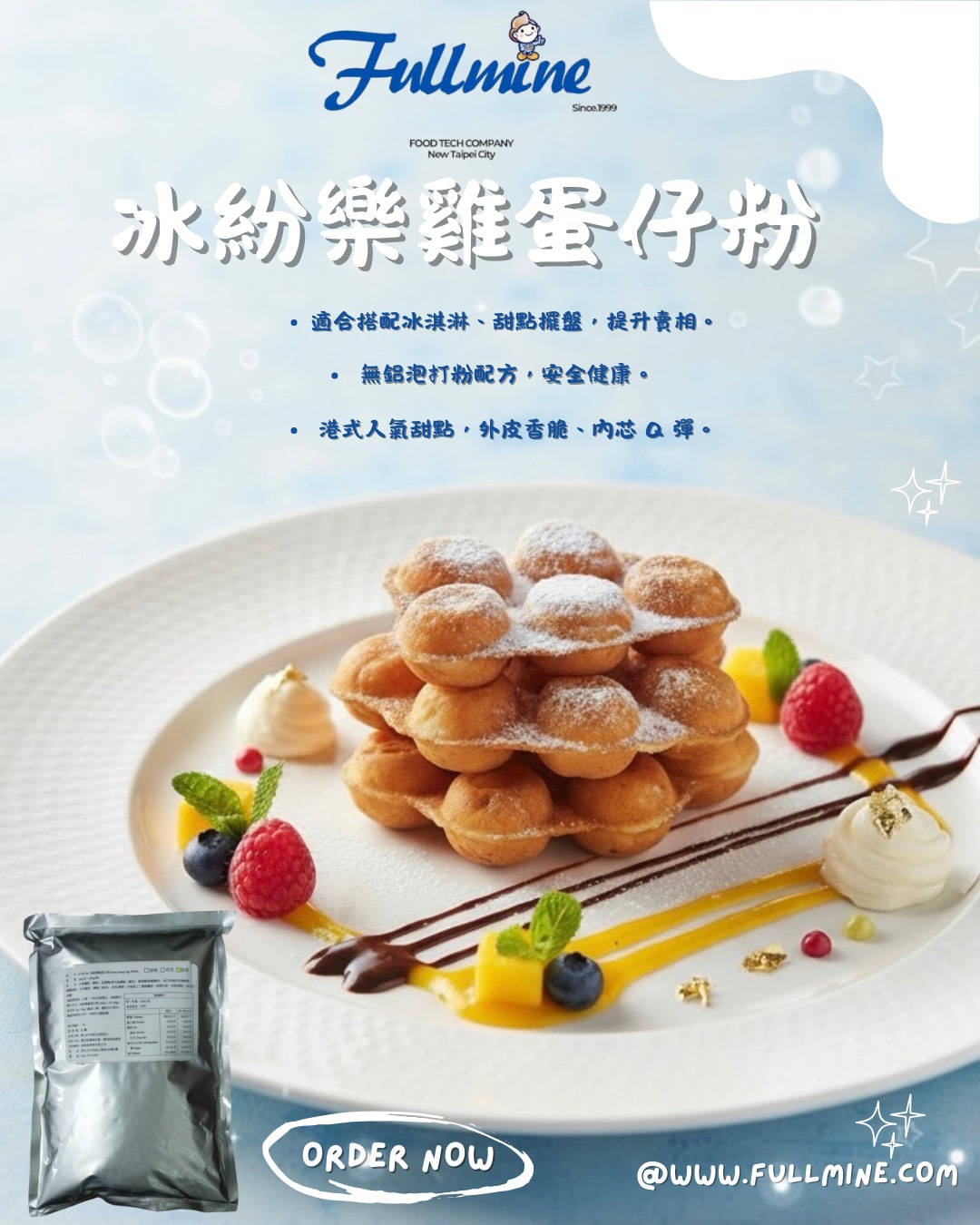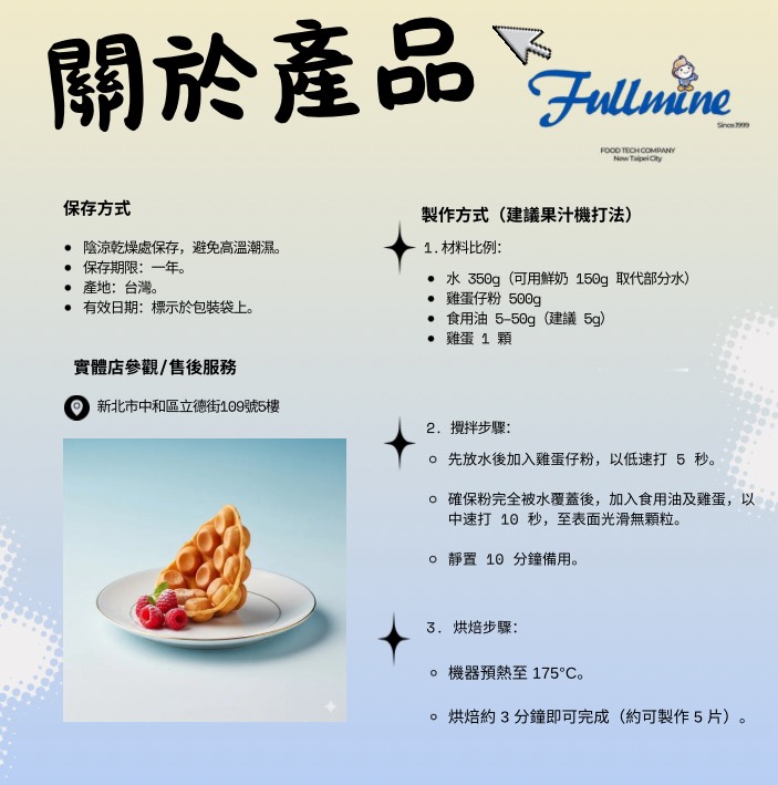 ICE FUN冰紛樂雞蛋仔粉口味: 原味,可可,草莓...等代客研發口味,1kg裝/20包/箱! 成分:麵粉、糖、羥丙基磷酸二澱粉、樹薯澱粉、泡打粉(酸性焦磷酸鈉、碳酸氫鈉、玉米澱粉、磷酸二氫鈣)、香料、二氧化矽、食鹽 產地:台灣